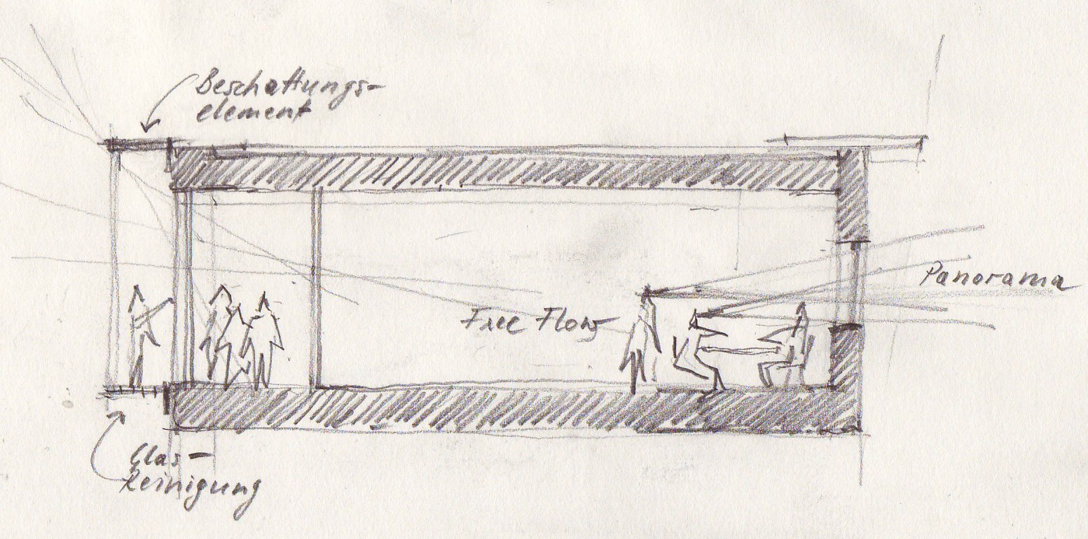 Bestehende Dächer über 1. OG werden zu Gründächern. Zusätzlicher Nutzen ist durch die Anbindung an die umgebenden Dächer der Zwischenbauten als Grün- und Erholungsflächen im Freien gegeben. Dies ist ein Vorschlag die derzeitigen Dächer zu nutzen. Vorraussetzung ist natürlich die Belastbarkeit des Bestands. Nachdem ein Gründach wesentlich leichter als eine Aufstockung ist, liegt eine Verwirklichung eher im Einflussbereich der Finanzen denn der Statik.
